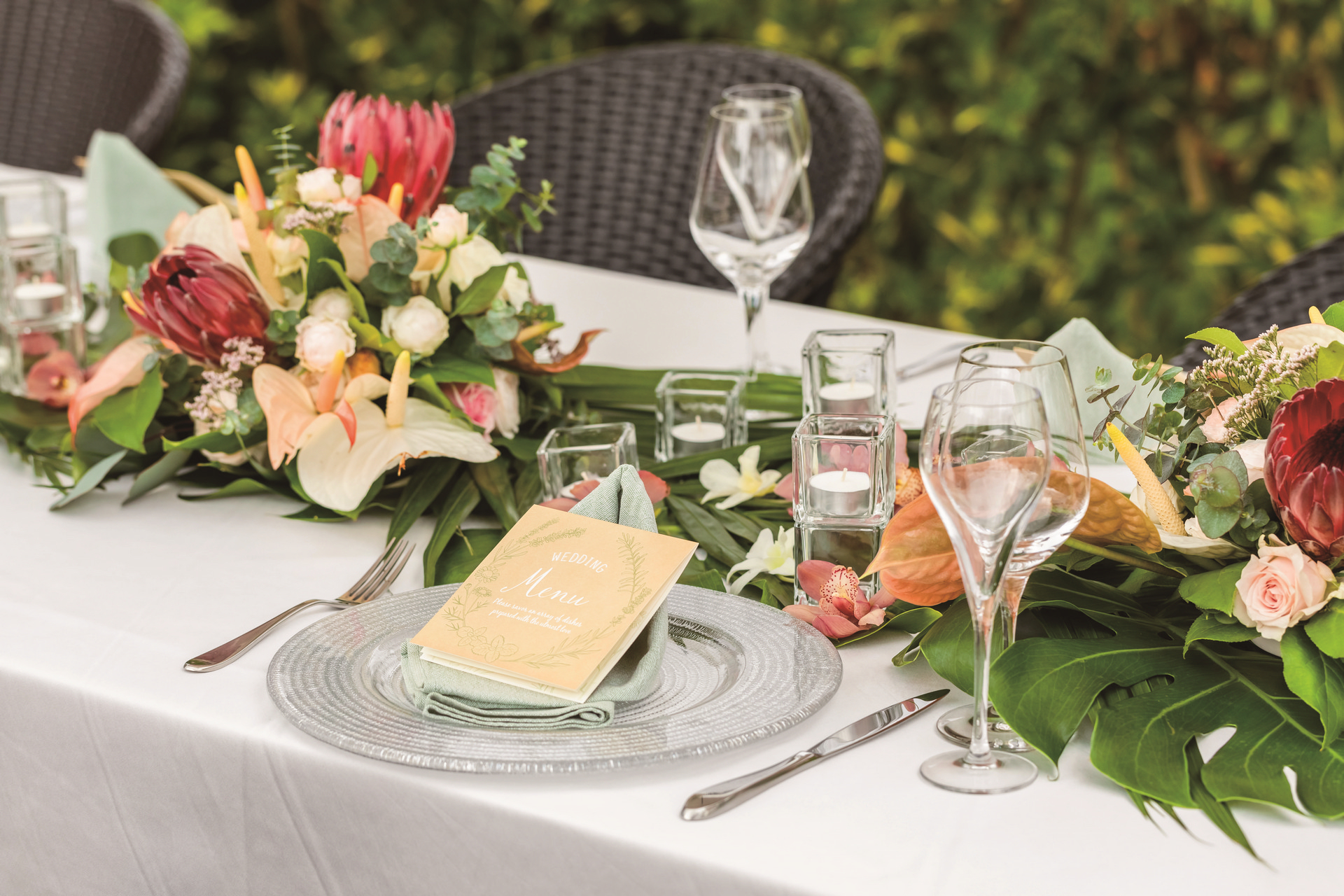 会场布置: 场内桌花与主题布置(有: 现代风格、植物系、绿意系、热带风味或NAOCO原创风格等)可依照新人风格喜好规划。