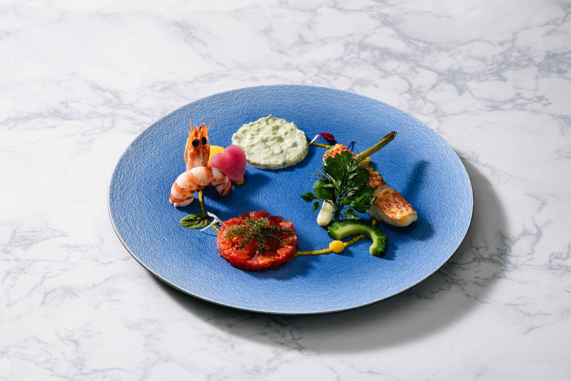Entrée froide|海风前菜: 鲜虾与炙鱼搭配蔬果,展现海岛色彩。