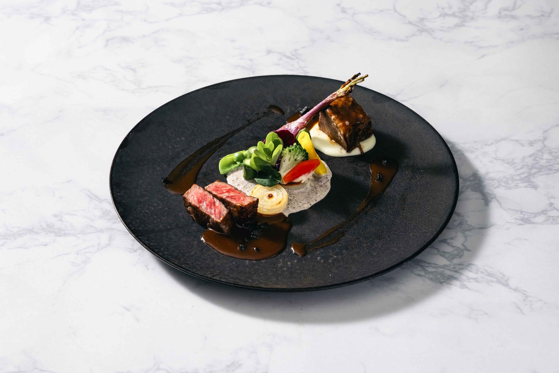 Plat principal|主菜祝福: 嫩煎牛排佐蔬菜与酱汁,经典雅致。