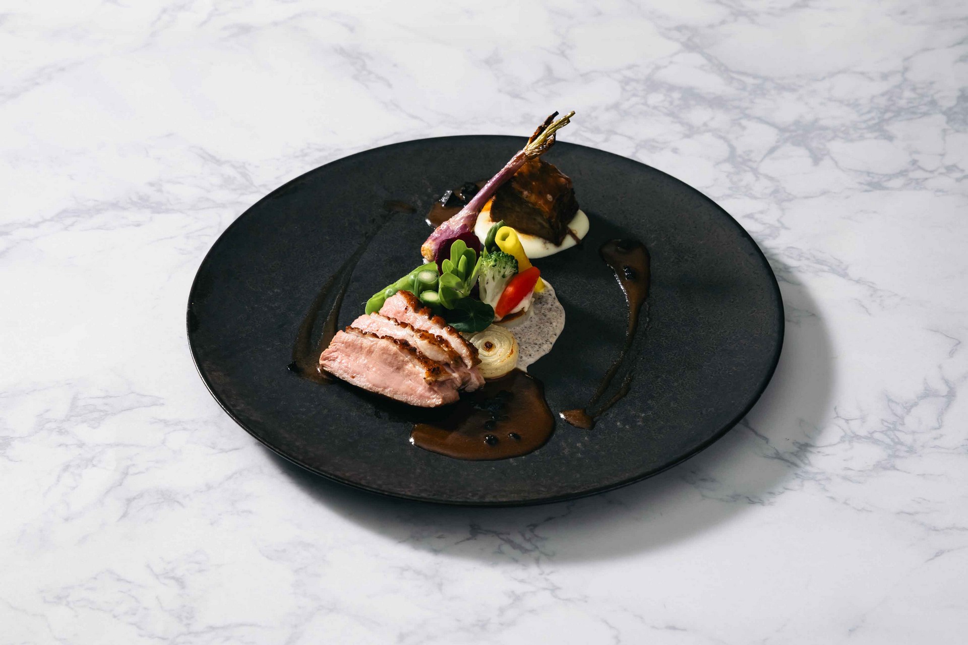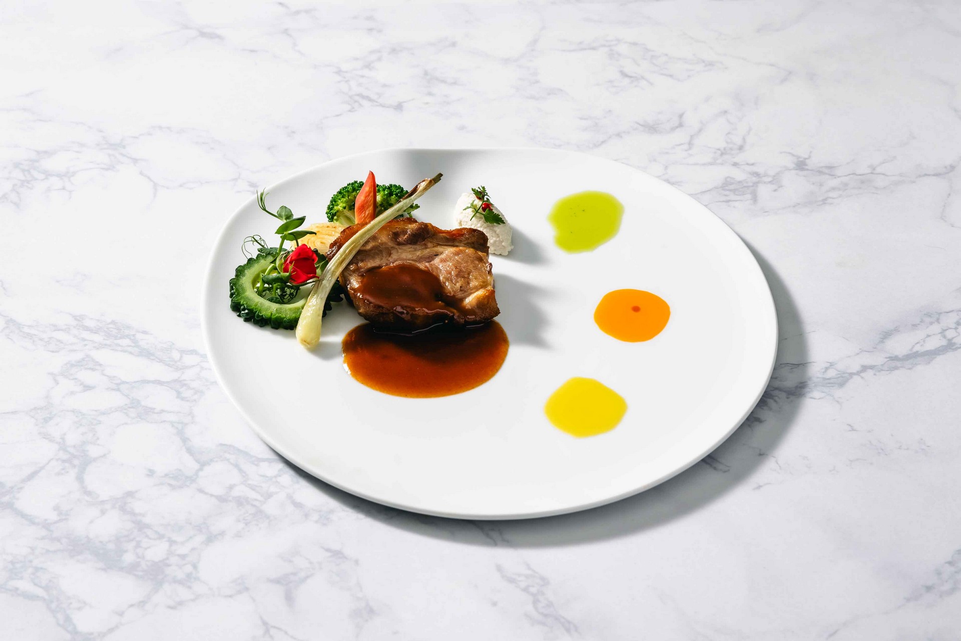 Entrée chaude|热前菜:香煎猪肉佐缤纷时蔬,带出食材原味与视觉趣味。