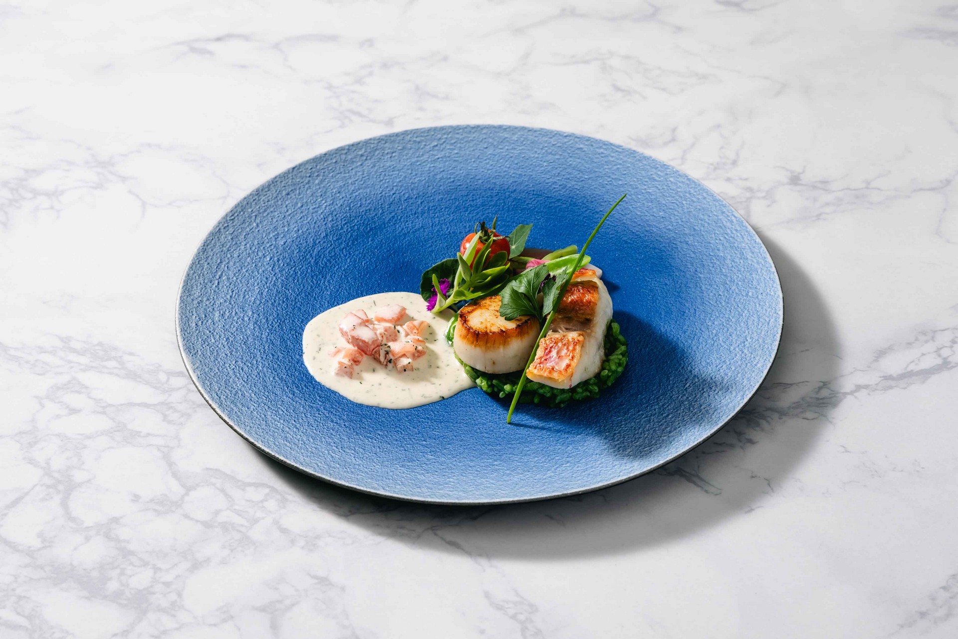 Poisson|海鲜主菜: 干贝与白身鱼,佐香草奶酱。
